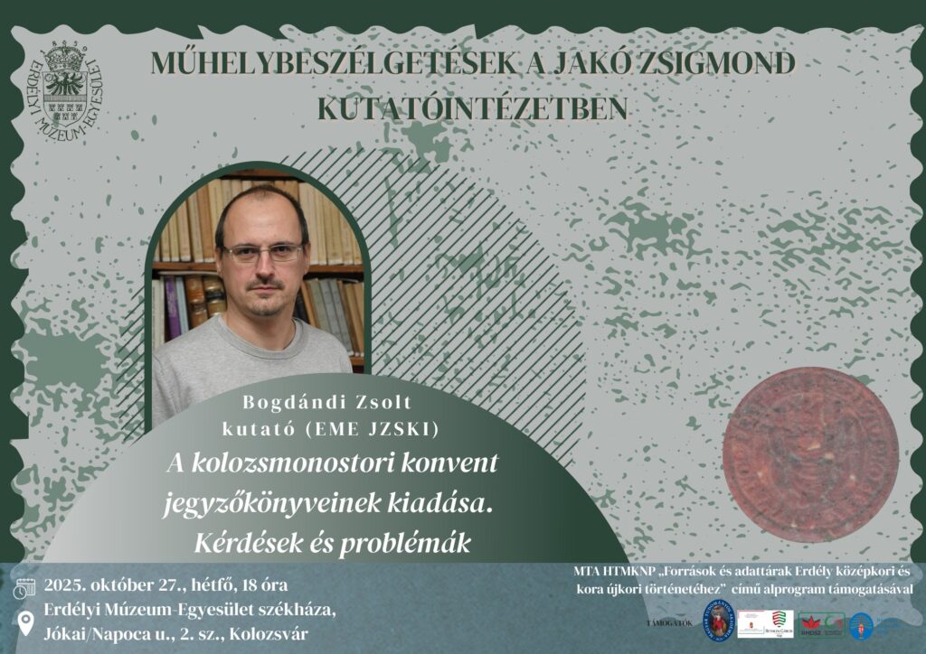 A Műhelybeszélgetések a Jakó Zsigmond Kutatóintézetben rendezvénysorozat keretein belül kerül sor 2025. október 27-én, hétfőn 18 órától munkatársunk Bogdándi Zsolt: A kolozsmonostori konvent jegyzőkönyveinek kiadása. Kérdések és problémák című előadására, az EME székházának előadótermében.