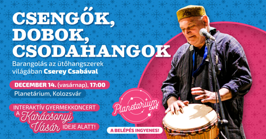 ❗️ 17 órától egy minden korosztály számára izgalmas meglepetéseket tartogató INTERAKTÍV GYERMEKKONCERTRE várjuk az érdeklődőket. 👉 Cserey Csaba, aki több mint 50 éve dobol, valamint a hazai jazz-élet legjelentősebb alkotóival zenélt már együtt, a ütőhangszerek világába vezeti be a kicsiket, a nagyobbacskákat és a szüleiket. 🥁 Zenéljünk együtt és hangolódjunk közösen az ünnepekre a Planetáriumban!