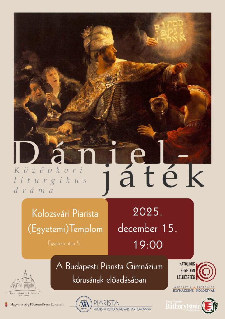Szeretettel hívunk minden érdeklődőt egy különleges adventi lelki és kulturális estére! A Dániel-játék (Ludus Danielis) a középkor egyik legszebb és legismertebb liturgikus drámája, amely Dániel próféta történeteit – köztük Baltazár király lakomáját és a „falra írt jel” titokzatos jelenetét – kelti életre. A mű a 12–13. században vált népszerűvé, és máig lenyűgöző példája a középkori egyházi zenés színjátéknak.