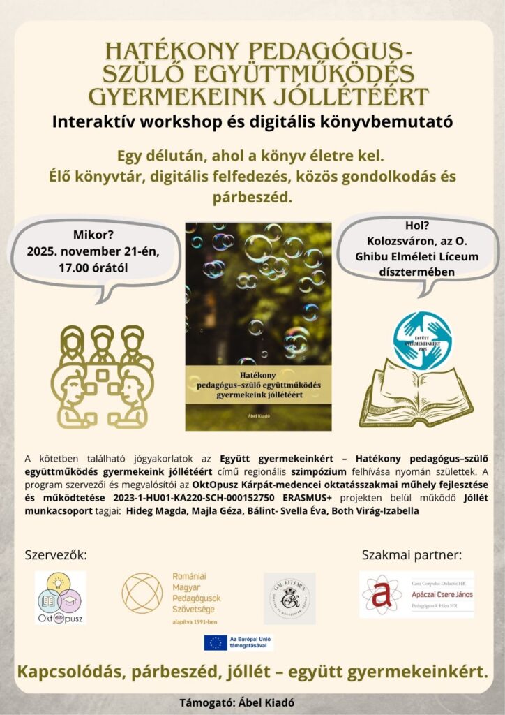 A kolozsvári Gál Kelemen Oktatási és Módszertani Központ és az OktOpusz– Jóllét munkacsoport szeretettel hívja az érdeklődőket egy interaktív workshopra és digitális könyvbemutatóra.
