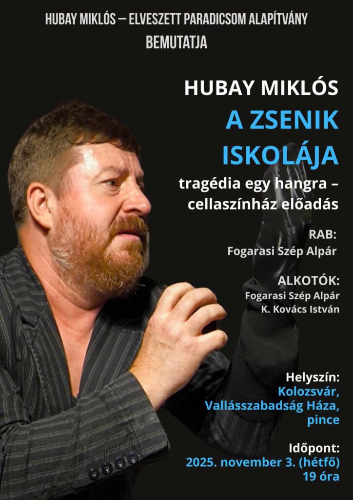Tisztelettel meghívunk és szeretettel várunk minden érdeklődőt Hubay Miklós: A ZSENIK ISKOLÁJA című monodrámájának előadására, amelyre november 3-án, hétfőn, 19 órától kerül sor a Vallásszabadság Házának pincéjében.