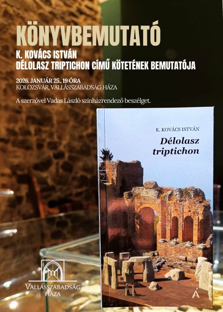 Tisztelettel meghívunk és szeretettel várunk minden érdeklődőt, K. Kovács István: DÉLOLASZ TRIPTICHON című kötetének a könyvbemutatójára, amelyre vasárnap, január 25-én, 19 órától kerül sor a Vallásszabadság Házában.