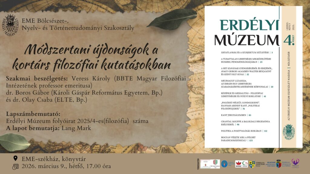 Az EME Bölcsészet- Nyelv- és Történettudományi Szakosztálya szeretettel meghívja 2026. március 9-én, 17 órától az EME székházába az idei év első filozófiai rendezvényére, melyen Veress Károly, a BBTE Magyar Filozófiai Intézetének professor emeritusa dr. Boros Gábor (Károli Gáspár Református Egyetem, Bp.) és dr. Olay Csaba (ELTE, Bp.) filozófusokkal, egyetemi tanárokkal beszélget a közelmúltban megjelent könyveikről.