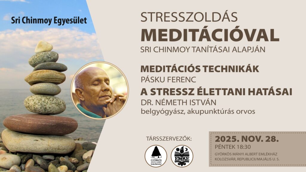 ▶️ A Sri Chinmoy Alapítvány által szervezett esemény első felében Pásku Ferenc mutatja be a stressz kialakulásának megelőzését, valamint a feszültség oldását segítő meditációs gyakorlatokat. Sri Chinmoy tanításain alapuló, egyszerű és bárki által elsajátítható technikák segítségével vezet be a belső béke és tudatosság világába, amelyek a mindennapokban is alkalmazhatók.