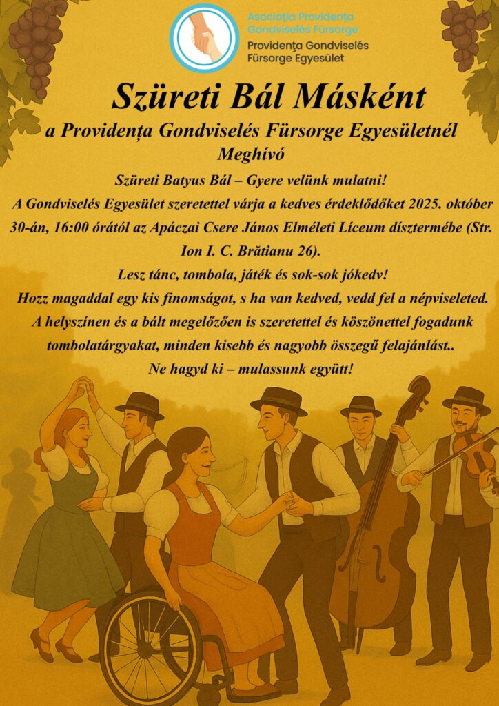 Szeretettel várunk mindenkit a Szüreti Bál Máskéntre október 30-án az Apáczai Csere János dísztermébe 16:00-kor.