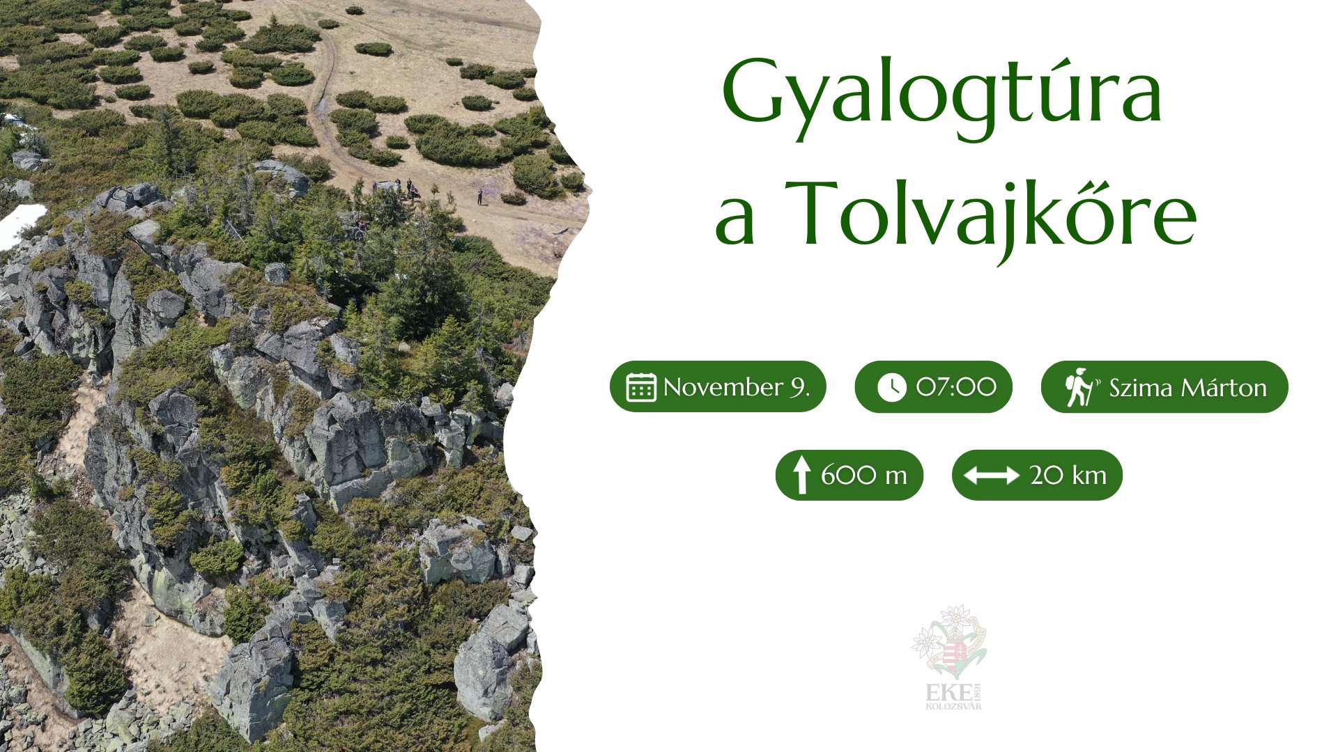 Szeretettel várunk minden érdeklődőt november eleji gyalogtúránkra, amelyet a Tolvajkőre szervezünk. Az útvonal hossza oda-vissza 20 km, teljes szintemelkedés 600 m. Az utazást mikrobusszal szervezzük. Indulás: november 9-én, vasárnap reggel 7:00-kor a volt FLIP üzlettel (buszmegálló, Mihai Viteazul (volt Széchenyi) tér 9A szám) szembeni parkolóból. A buszban a helyek száma korlátozott, ezért előzetesen kell jelentkezni, […]