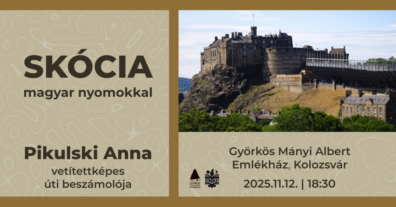 2025. november 12-én, szerdán, 18:30 órától Skócia, magyar nyomokkal címmel tart vetítettképes úti beszámolót PIKULSKI ANNA, a Györkös-ház visszatérő vendége. A Kolozsvárról Stuttgartba elszármazott világutazó több alkalommal osztotta már meg a világ különböző tájain szerzett élményeit a Györkös-ház közönségével, rengeteg fotóval illusztrálva, mindannyiszor telt ház előtt. Pikulski Anna tapasztalt világjárónak számít. Ezúttal újabb, meglepetésekkel szolgáló útjáról számol […]