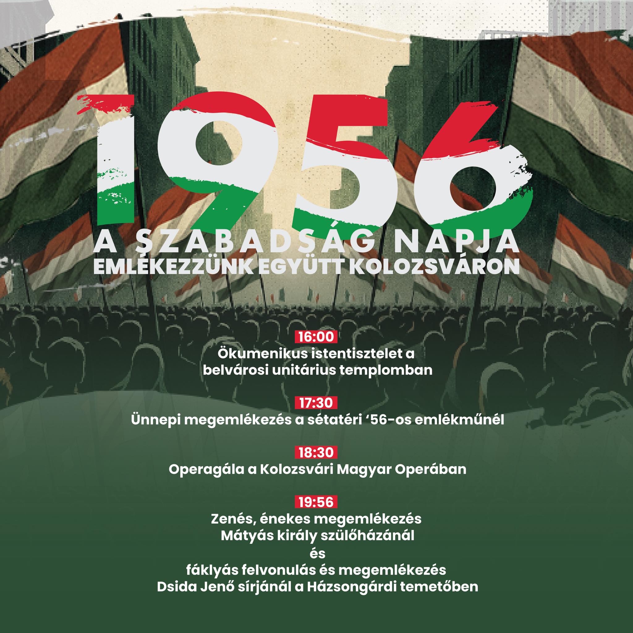 Október 23-án, ’56 hőseire emlékezünk Kolozsváron. Ebből az alkalomból több programpontból álló megemlékezést szervezünk a szabadságharc hőseinek tiszteletére: Október 23. 16:00 Ökumenikus istentiszteletHelyszín: Belvárosi unitárius templom, Magyar utca (Bld. 21Decembrie 1989), 9. sz. 17:30 Ünnepi megemlékezésHelyszín: Sétatér, 1956-os emlékmű 18:30 Ünnepi hangverseny az 1956-os forradalom és szabadságharc évfordulóján, a Kolozsvári Magyar Opera zenekarának ünnepi koncertje, […]