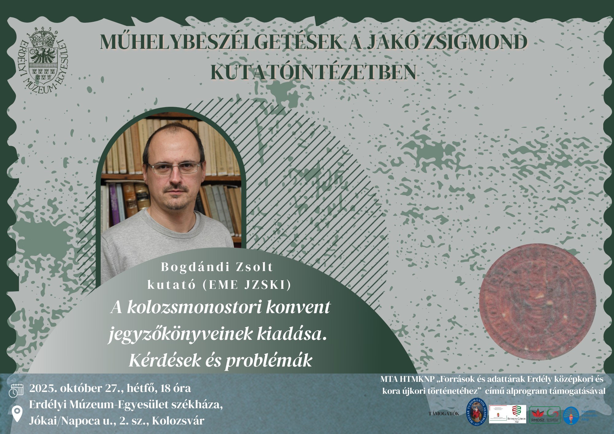 A Műhelybeszélgetések a Jakó Zsigmond Kutatóintézetben rendezvénysorozat keretein belül kerül sor 2025. október 27-én, hétfőn 18 órától munkatársunk Bogdándi Zsolt: A kolozsmonostori konvent jegyzőkönyveinek kiadása. Kérdések és problémák című előadására, az EME székházának előadótermében. A rendezvénysorozat az MTA HTMKNP „Források és adattárak Erdély középkori és kora újkori történetéhez” című alprogram támogatásával valósul meg. Minden érdeklődőt […]