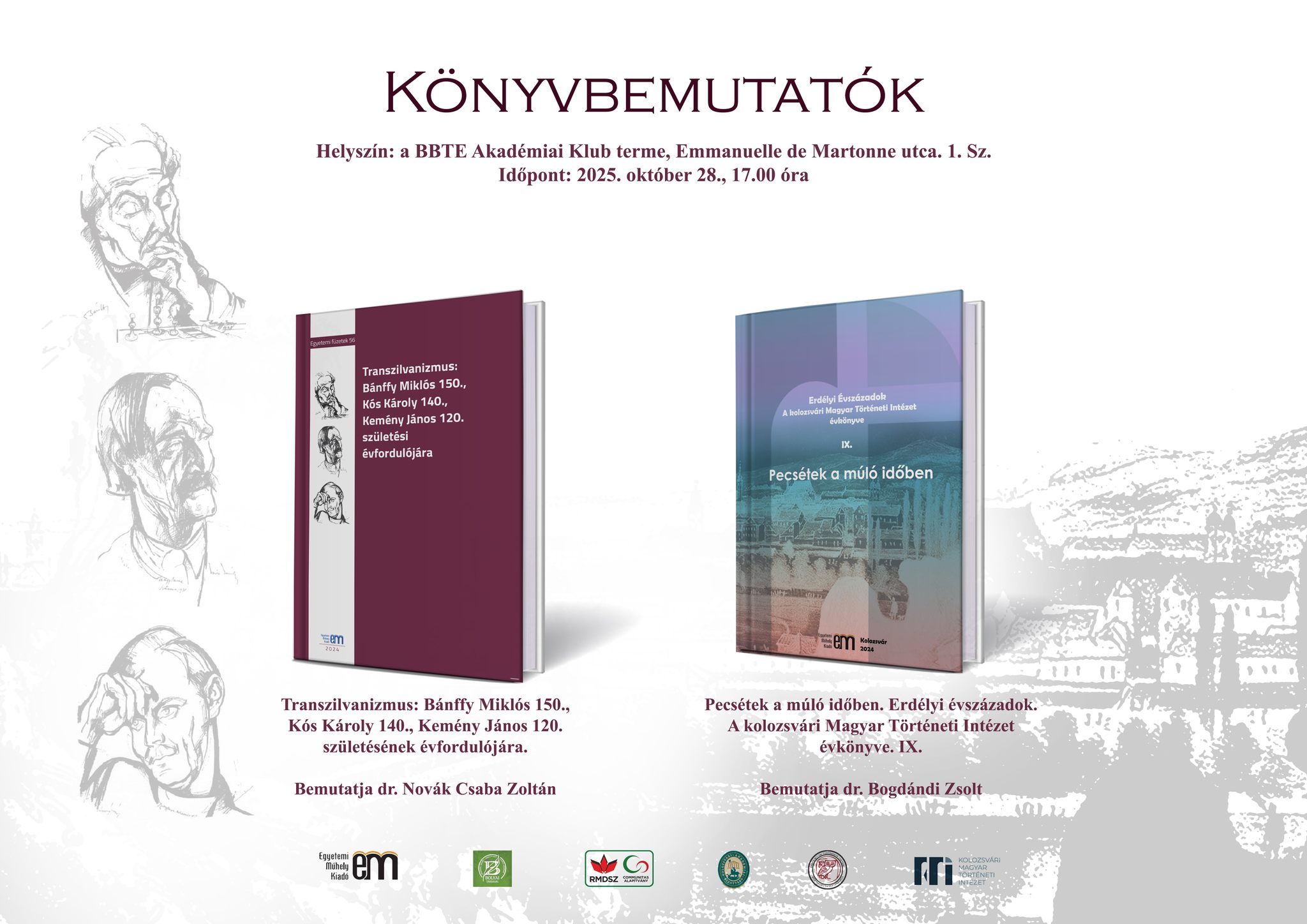 A kolozsvári Magyar Történeti Intézet szeretettel vár minden érdeklődőt a következő kettős könyvbemutatóra: Pecsétek a múló időben. Erdélyi évszázadok. A kolozsvári Magyar Történeti Intézet évkönyve. IX. Szerkesztette: Nagy Róbert Miklós és Izsán CsabaBemutatja dr. Bogdándi Zsolt Transzilvanizmus: Bánffy Miklós 150., Kós Károly 140., Kemény János 120. születésének évfordulójára. Szerkesztette: Toth SzilárdBemutatja dr. Novák Csaba Zoltán