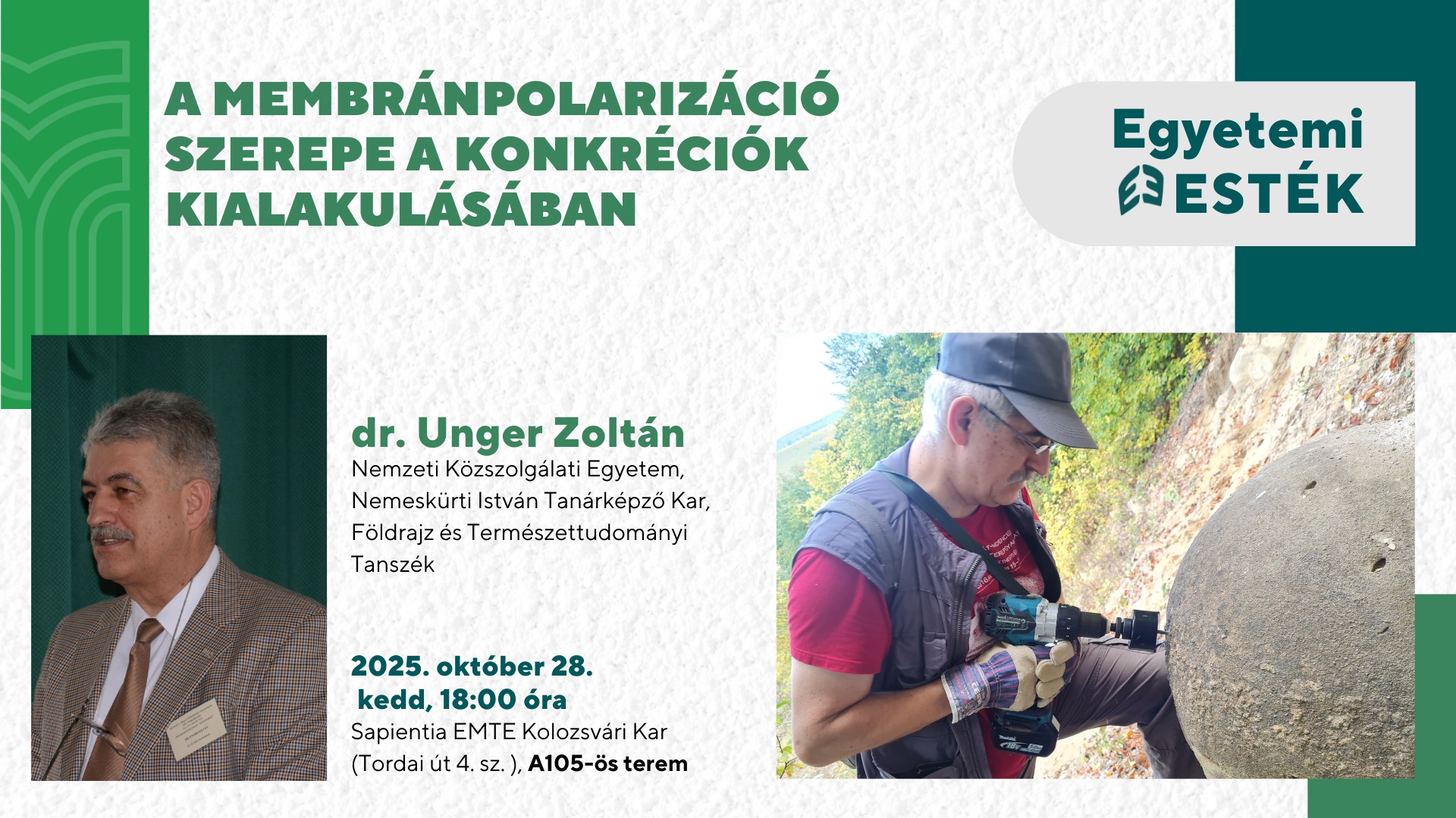 Az Egyetemi Esték rendezvénysorozat következő előadására október 28-án, kedden 18:00 órától kerül sor az A105-ös teremben (Tordai út 4. szám), melyet dr. Unger Zoltán tart A membránpolarizáció szerepe a konkréciók kialakulásában címmel. Az előadás nyilvános, mindenki számára nyitott. Jól ismert jelenség a membránpolarizáció a geofizikában. Ennek mesterséges formája a viszonylag széles körben alkalmazott gerjesztett polarizációs […]