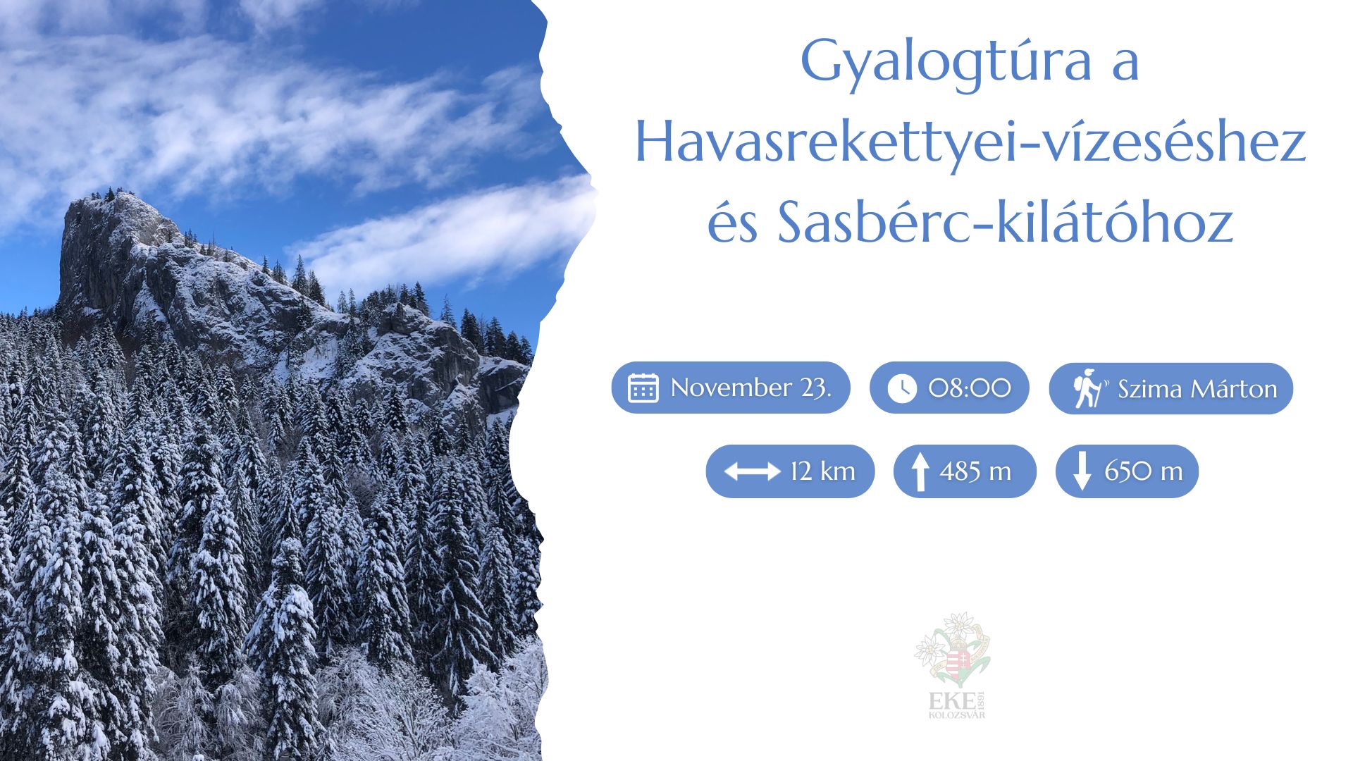 Szeretettel várunk látványos gyalogtúránkra, amely során megcsodálhatjuk a Havasrekettyei (Menyasszony fátyla)-vízesést közelről és madártávlatból egyaránt a Sasbérc-kilátóról (Lespezi). A túra útvonala a következő: Stanciu-tisztás – Havasrekettyei-vízesés – Sasbérc-kilátó – Kőrizstető (Scrind-Frăsinet). A túra hossza 12 km, teljes szintemelkedés 485 m, teljes szintereszkedés 650 m. Az utazást kisbusszal szervezzük. Indulás: november 23-án, vasárnap reggel 8:00-kor a […]