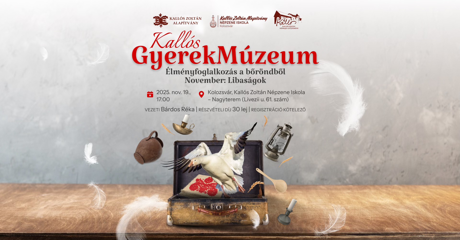 Indul a bőröndös múzeumpedagógiai sorozatunk Kolozsváron! 🎒 Minden hónap egyik szerdáján a Kallós Gyűjtemény kincsei kelnek életre dalokkal, játékokkal, ízekkel – és valódi néprajzi tárgyakkal. 🎶🥣 Az első alkalom témája: Libaságok – Szent Márton környéki mondókákkal, énekekkel, játékokkal és libához kapcsolódó finomságokkal. 🪿🍂 Vezeti: Bárdos Réka 👩🏫 Mikor? 2025. november 19. (szerda), 17:00 🕔 Hol? […]