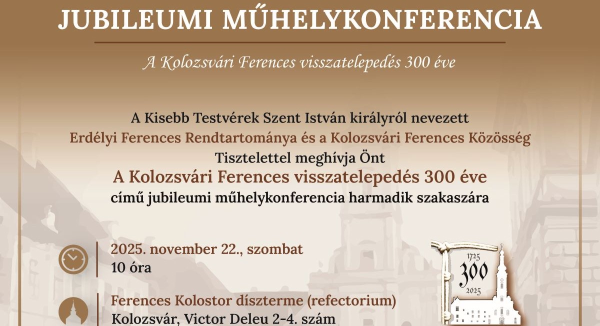 Több szakaszban készült a kolozsvári ferences közösség a kisebb testvérek 300 évvel ezelőtti kincses városba való visszatelepedésének megünneplésére. Ennek a készületnek volt része a tavaly és tavalyelőtt novemberben megtartott műhelykonferencia két szakasza, amelyen domonkos, unitárius, református, jezsuita egyháztörténészek, valamint művészettörténészek, történészek, építészek mutatták be az óvári kolostor 1725 előtti közösségeinek időszakát. A konferenciasorozat idén, november […]