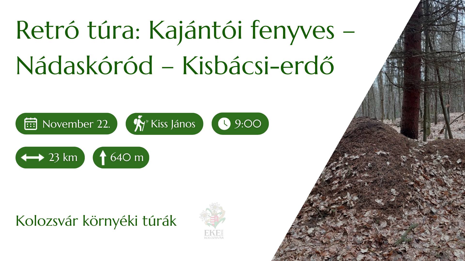 Ha szívesen kimozdulnátok a természetbe szombaton, szeretettel várunk gyalogtúránkra az alábbi útvonalon: Kajántói fenyves – Nádaskóród – Kisbácsi-erdő. Az útvonal hossza 23 km, szintkülönbség 640 m. Találkozás 9 órakor a vasútállomás előtt. Amennyiben szeretnétek részt venni, kérünk, jelentkezzetek be telefonon november 20-ig a szervezőnél. Szervező: Kiss János (0364-807639).