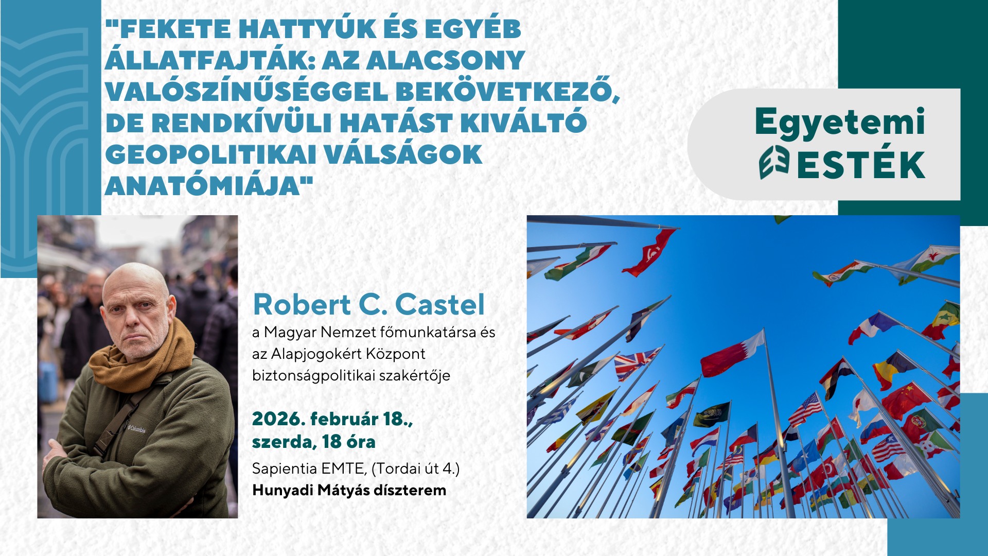 Sapientia EMTE, Kolozsvár Tordai út 4. sz., Kolozsvár, Kolozs, RomániaAz Egyetemi Esték rendezvénysorozat következő részében Robert C. Castel, a Magyar Nemzet főmunkatársa és az Alapjogokért Központ biztonságpolitikai szakértője tart előadást "Fekete hattyúk és egyéb állatfajták: Az alacsony valószínűséggel bekövetkező, de rendkívüli hatást kiváltó geopolitikai válságok anatómiája” címmel. Az előadás nyilvános és ingyenes, de regisztrációhoz kötött. A helyek száma korlátozott. Regisztrálni az alábbi linken lehet: […]